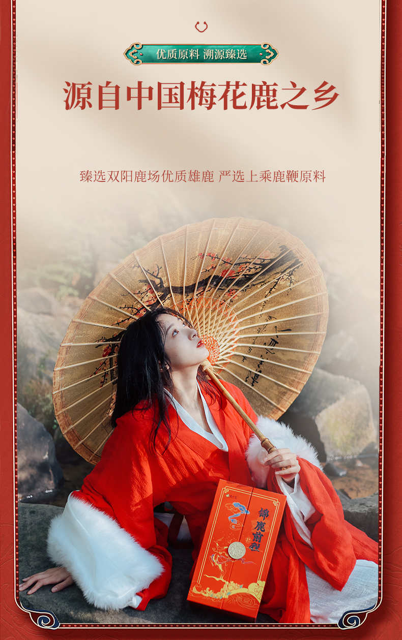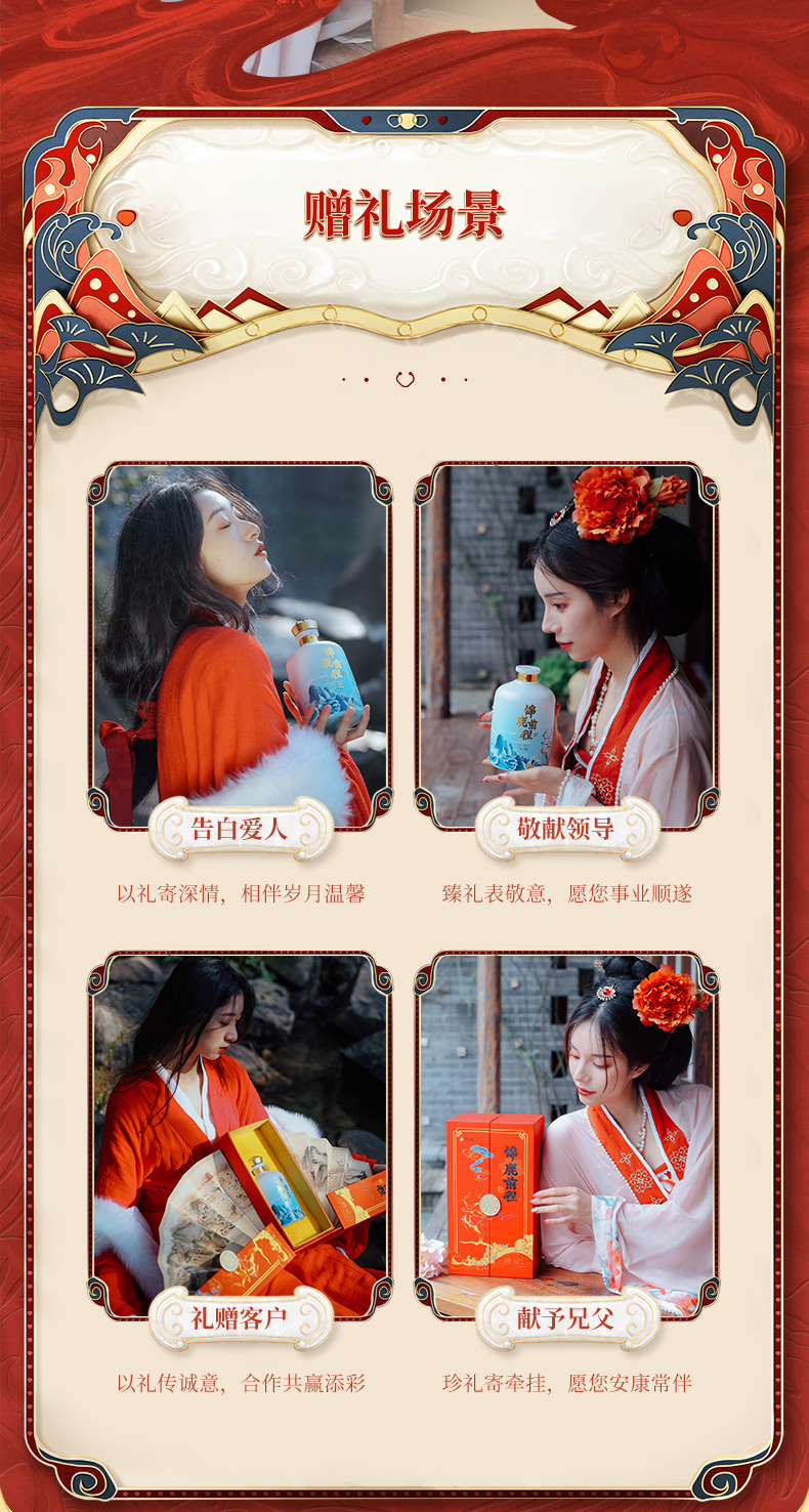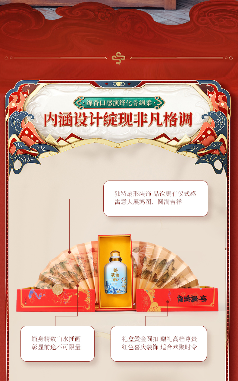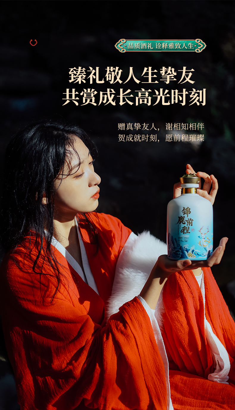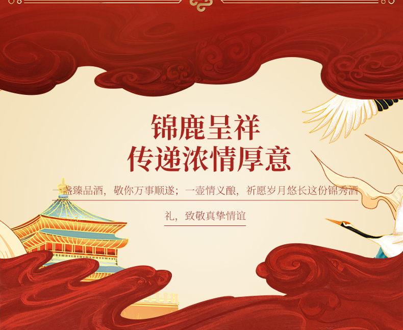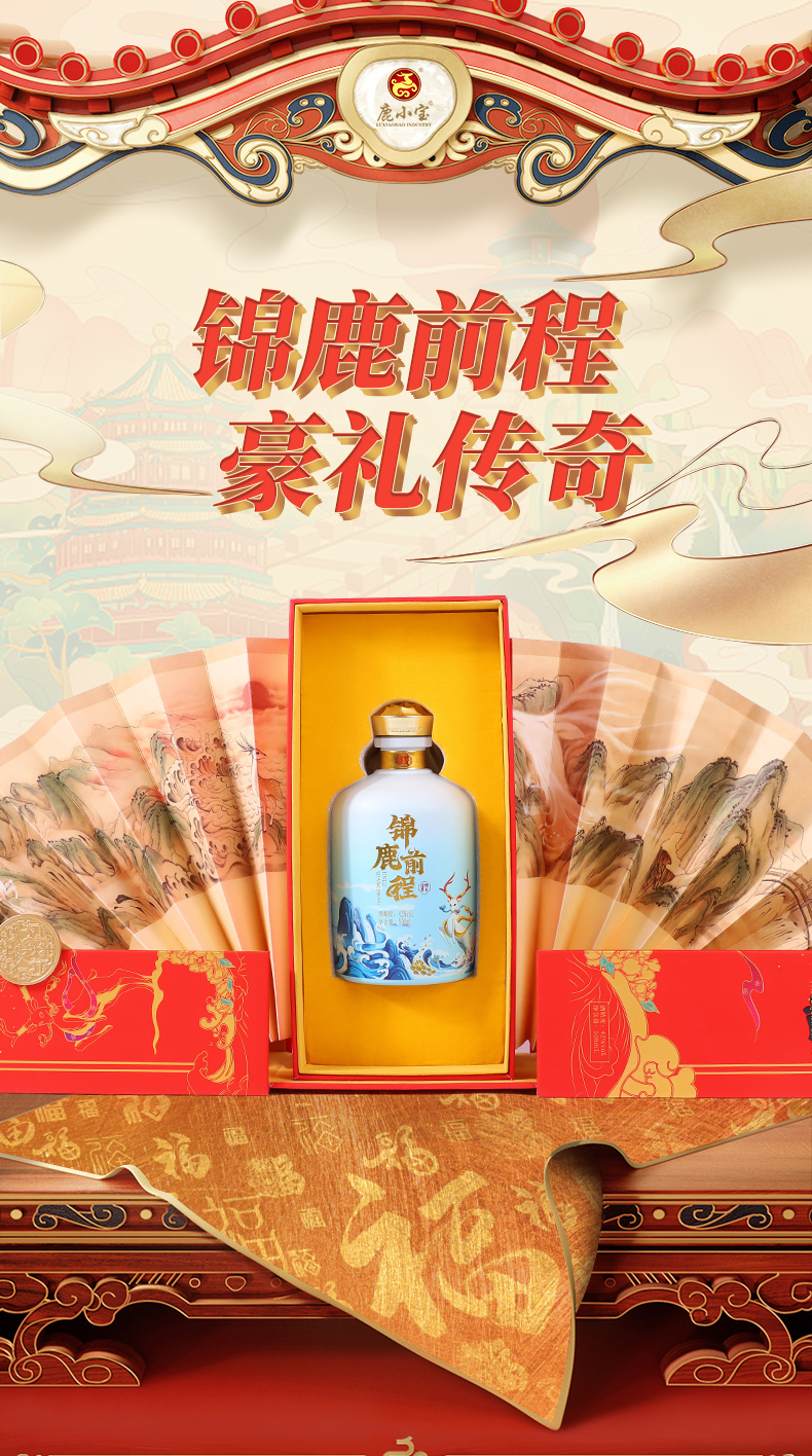 此产品为锦鹿前程系列,独特扇形装饰品饮更有仪式感,寓意大展鸿图、圆满吉祥.锦鹿前程豪礼传奇,瓶身精致山水插画彰显前途不可限量.礼盒烫金圆扣,赠礼高档尊贵.红色喜庆装饰适合欢聚时令,您值得拥有.