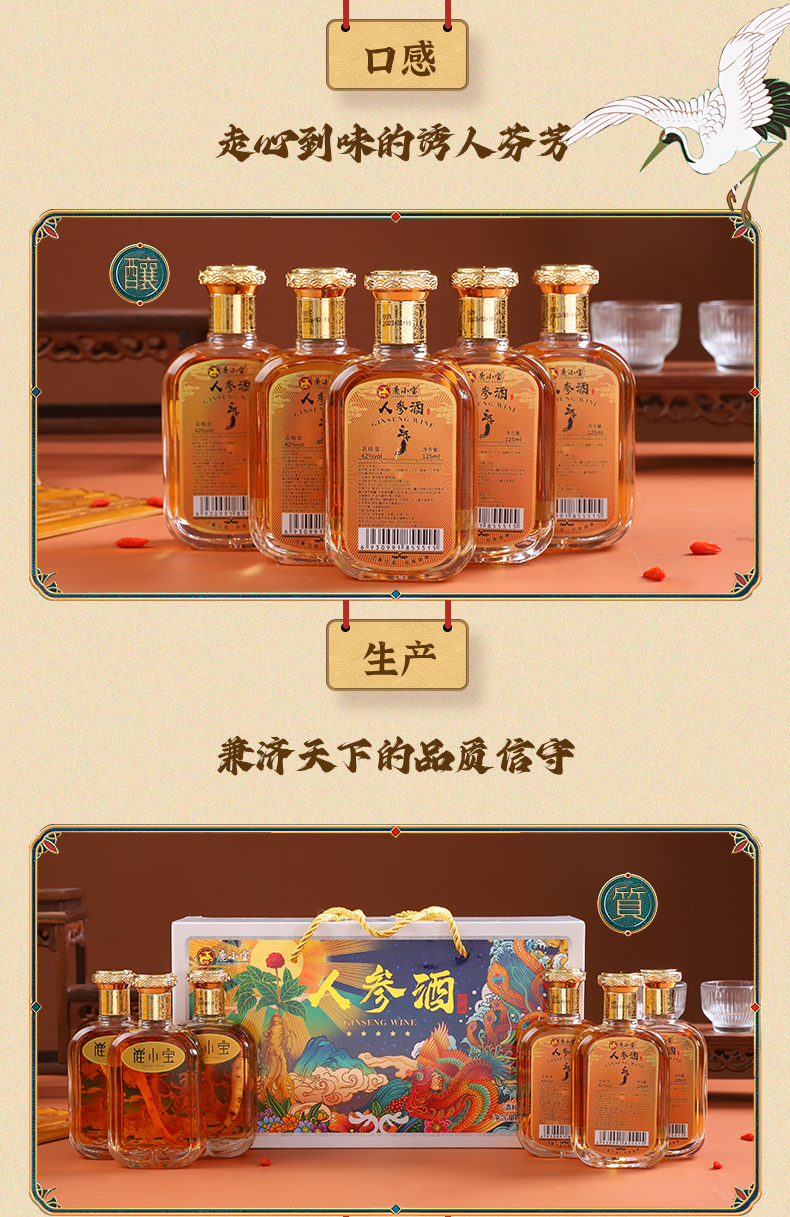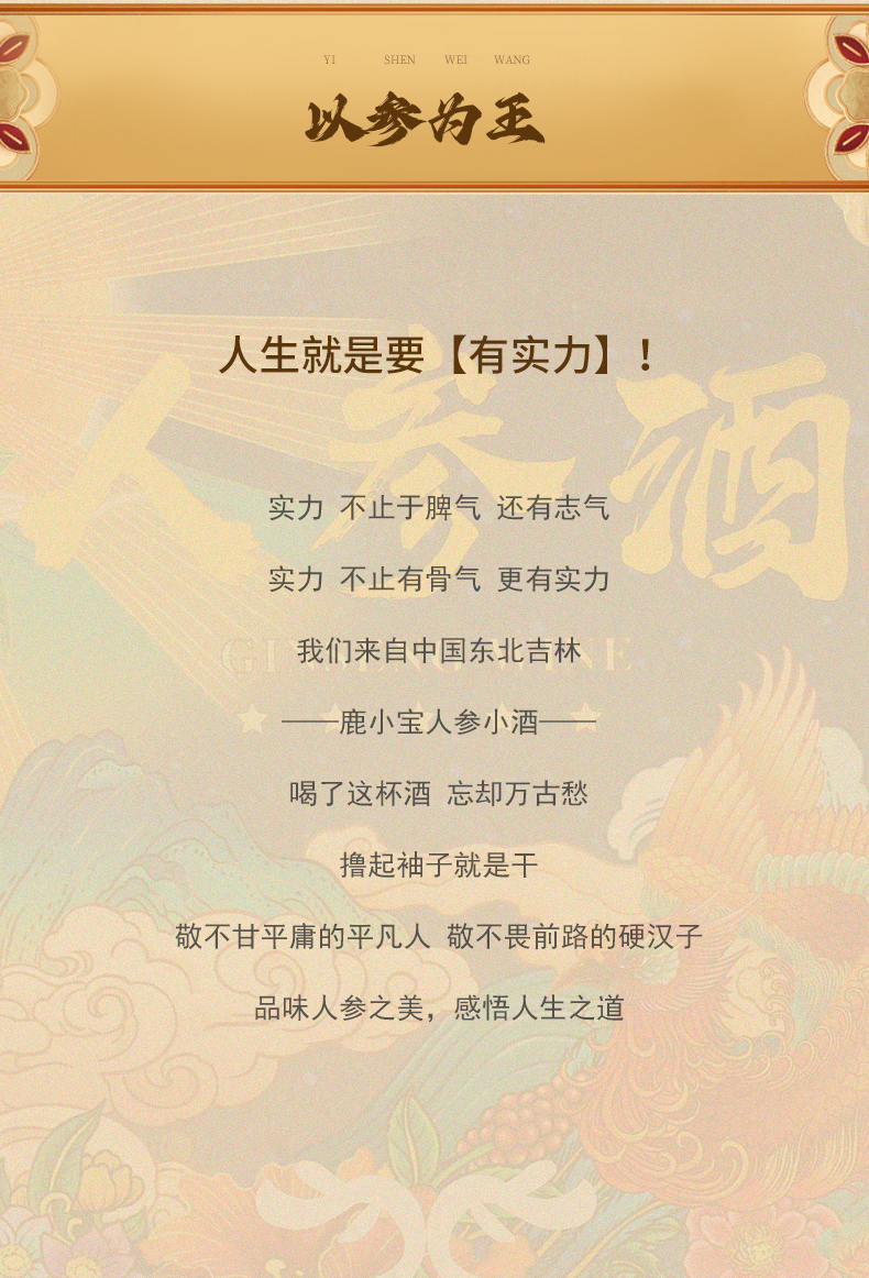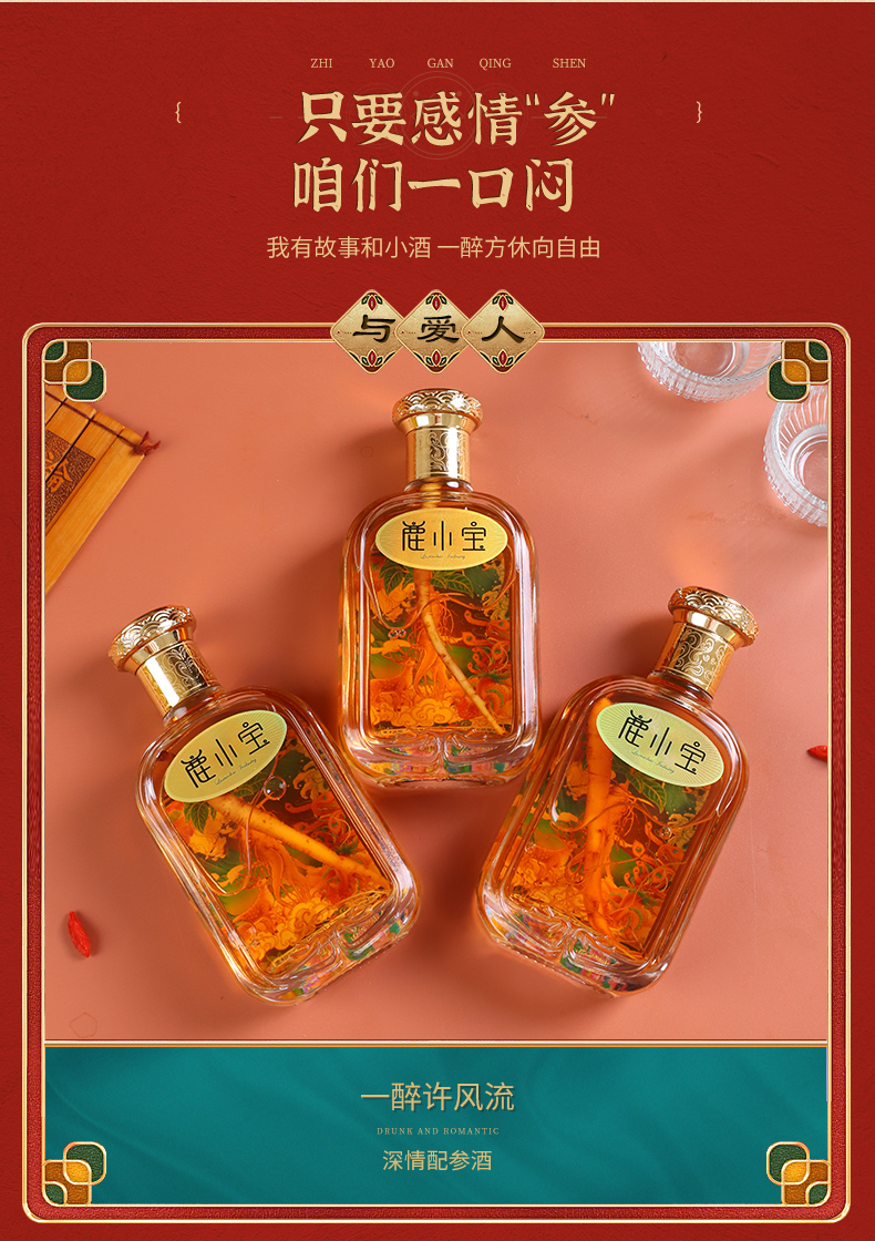 鹿小宝品牌----此产品小酒系列人参酒,精白瓶身,每瓶都有一颗人参,新型背透设计,自饮送礼之上选.