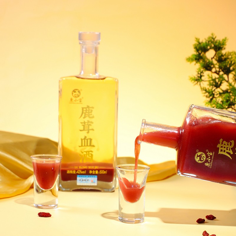 此产品由鹿茸血酒x1,包装盒选用工业版材质,烫金工艺,设计简洁大气,整体显得精美大气.